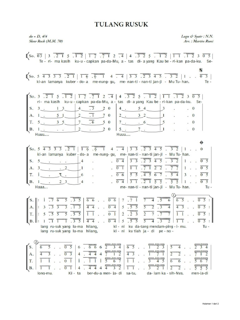 Tulang Rusuk Partitur SATB Terima kasih kuucapkan pada-Mu atas dia yang Kau berikan padaku. Kau tulang rusuk yang ku. Tulang rusuk yang lama hilang.